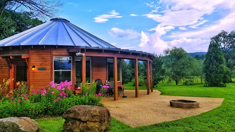 Rose River Farm features three exceptional (Trip Advisor Rated Excellent) rental cabins for overnight guests located "catty corner" to the main farm on a private 20 acre parcel that has beautiful views of the Blue Ridge Mountains and the Rose River Valley. The round cabins are modern day interpretations of classic Mongolian Yurts. Constructed of cedar, glass and steel, each cabin is over 1,100 square feet and has central AC/Heat. All three cabins feature two bedrooms with two full baths. Each bedroom has two double beds. The living room features a domed 17 ft ceiling, leather club furniture and a jumbo flat screen TV with satellite, DVD player and even an iPod docking stereo. Unlimited high speed WIFI is available at no charge. There is also a full kitchen (stove, oven, microwave, full size fridge and freezer with ice maker) and a nice round dining / gaming table for eating or a little evening cards. There is even a fly tying table with a Regal vise.