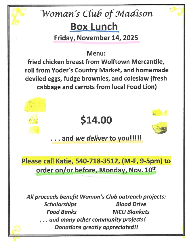 Woman's Club of Madison - call Katie 540-718-3512 Before 11-10 (M-F 9-5)