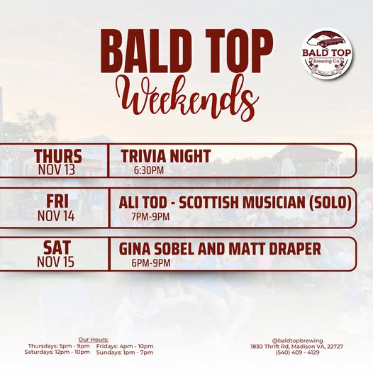 Saturday, 6–9PM: Welcome back Sobel and Draper. These two always light up the night with stunning harmonies, heartfelt lyrics, and incredible musicianship. A little soul, a little folk, and a lot of good vibes. It’s going to be a weekend full of music, laughter, and community, see you at Bald Top!