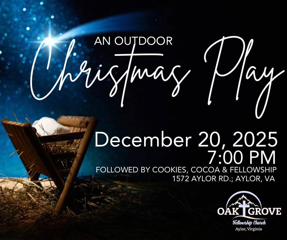 Join us for our annual live outdoor Christmas Play. We have done this play for over 35 years and we would love for you to join us. The play will be outside so dress appropriately. The play will feature actors and live animals that will tell the true meaning of Christmas featuring the birth of our savior Jesus Christ. Hot Chocolate, coffee, and cookies will be available. Some seating is available but you are welcome to bring your own!