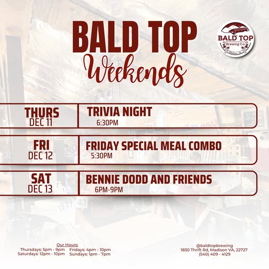 Then Saturday, from 6–9PM, Bennie Dodd and Friends return to light up the stage. With decades of rock and americana favorites, they always bring a set that gets your toes going long before you realize you’re moving. It’s familiar, fun, and exactly the kind of energy that makes Bald Top shine.
