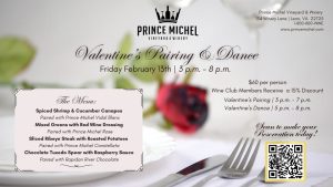 Treat your special someone to an evening of romance at Prince Michel Winery! Join us on Friday, February 13th for a Valentine’s Dinner Pairing & Dance that’s as memorable as your love story.