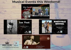 Great music this weekend. Big Gavel Classic-Friday. Ian Vest and Rixeyville Revival-Saturday and New to Prince Michel on Sunday-Junkyard Jones!!